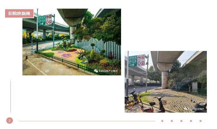 玄武區新莊立交橋下(進入內環東線、北線方向)綠地設施原狀為嵌草磚路面鋪裝,設施陳舊、單調,非機動車輛亂停放現象,影響城市景觀形象。在南京市綠化園林局及玄武區綜管所的統一部署下,玄武園林公司探索消極綠化空間更新的工作機制,對新莊立交高架橋下郁閉綠地空間因地制宜進行試點改造提升,勾畫一幅嶄新的城市街景,展現新時代城市園林景觀特色。
